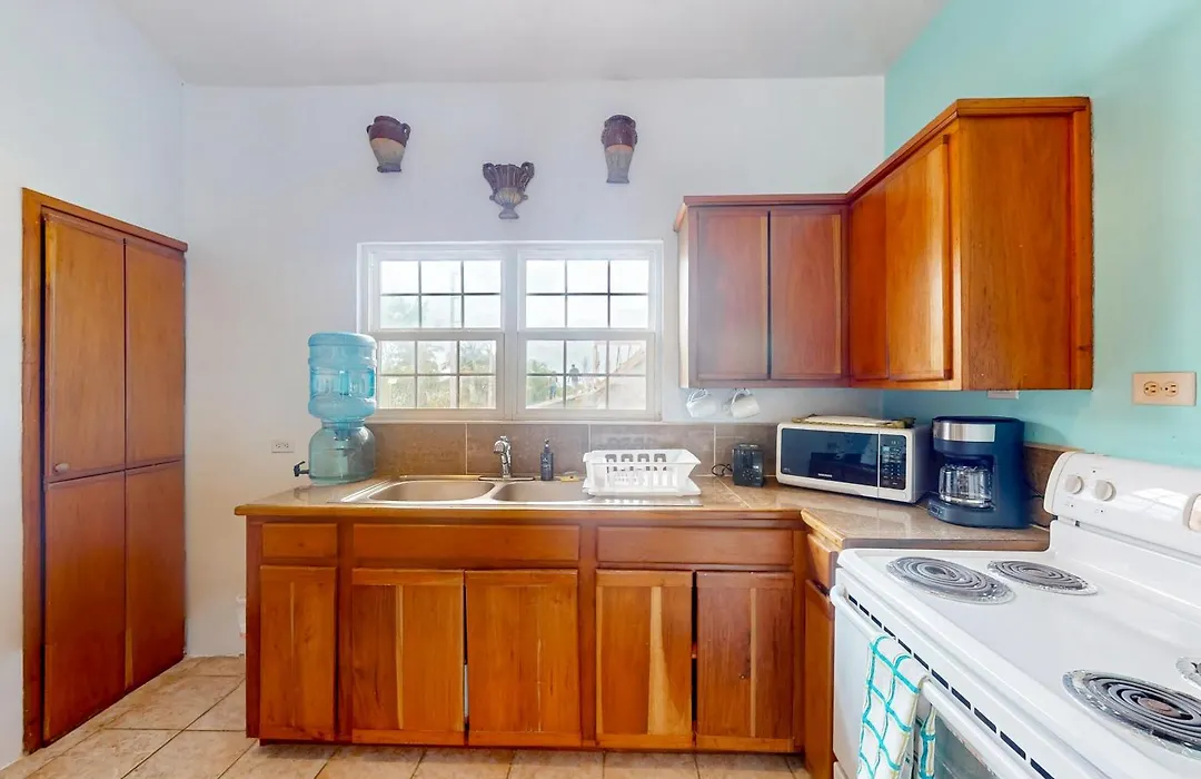 Cette villa de San Pedro est équipée d'équipements indépendants, notamment d'une cuisine complète et d'un coin repas pour le plaisir des clients. La cuisine est également équipée d'une cafétière/théière électrique, d'un réfrigérateur et de la vaisselle.